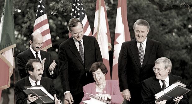 El primer Tratado, el TLCAN entró en vigor el 1 de enero de 1994, en paralelo al levantamiento zapatista. No fue el inicio sino la culminación de una estrategia de achicamiento del Estado, apertura comercial y desregulación de la economía. Lo primero se caracterizó por el remate o desaparición de las empresas de propiedad pública en los sectores de la siderurgia, telefonía, ferrocarriles, fertilizantes, aeropuertos y líneas aéreas, reprivatización de los bancos y muchas más.