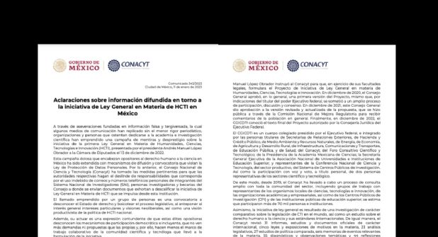 “Las notas [periodísticas] que a continuación se enlistan, citando el medio que las difunde, contienen información falsa, engañosa o reproduce [sic] declaraciones fundadas en mentiras, por lo que se invita a todas las comunidades en HCTI [humanidades, ciencias, tecnologías e innovación] y a la población en general a no dejarse sorprender por esta campaña de infodemia”. Y, en efecto, se apuntan 21 notas publicadas a partir de que se dio a conocer la iniciativa de Ley en materia de Humanidades, Ciencia, Tecnología e Innovación, presentada por el ejecutivo federal a mediados de diciembre de 2022, y hasta el 11 de enero de 2023, en más de 20 periódicos o sitios digitales. Lista a la que hay que sumar una nota que se denuncia en el cuerpo del comunicado y de la que proporcionan también el nombre de la autora. Dejando de lado que se trata de una periodista especializada en temas de mujeres y género, el simple hecho de ser una ciudadana le otorga el derecho a expresar su opinión y no ser señalada, discriminada, reprimida o juzgada por ello (artículos 1°, 6° y 7° de la Constitución Política Mexicana), al igual que a cada una de las personas que firmaron esos artículos o notas y a los medios que las dieron a conocer.