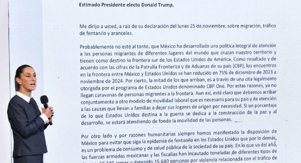 Probablemente no esté al tanto que México ha desarrollado una política integral de atención a las personas migrantes de diferentes lugares del mundo que cruzan nuestro territorio y tienen como destino la frontera sur de Estados Unidos de América". Le recuerda que los encuentros entre patrullas fronterizas y migrantes se han reducido en 75%, de diciembre del 2023 a noviembre del 2024, “según cifras de la Patrulla Fronteriza”.