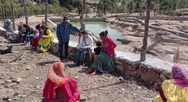 En compañía de habitantes de la comunidad de Boquimoba, en Chihuahua. A su espalda, la represa construida con apoyo de la Fundación Tarahumara José A. Llaguno. Foto: Carin Martínez.