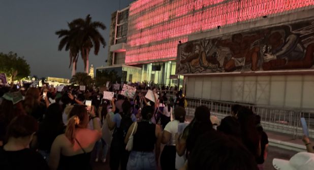 A lo largo del recorrido las jóvenes hicieron algunas pintas en las paredes y sólo al llegar al Palacio, desde donde desgobierna Layda Sansores, quien desearía ser conocida como “María Antonieta” –la que come marquesitas de cajeta mientras el pueblo no tiene para tortillas–, se dieron a la tarea de golpear los vidrios hasta hacerlos caer, mientras sonaba, la que podemos considerar ya himno: “Canción Sin Miedo” de Vivir Quintana. Dentro, las fuerzas antimotines en formación tortuga resguardaban el acceso al inmueble. En cada uno de los tres pisos del Palacio era posible observar la circulación de muchos individuos, del sexo masculino. Pero las mujeres no pretendían ni causar disturbios ni “tomar” Palacio de Gobierno, así que los antimotines y la Sansores recibieron una bofetada con guante blanco.