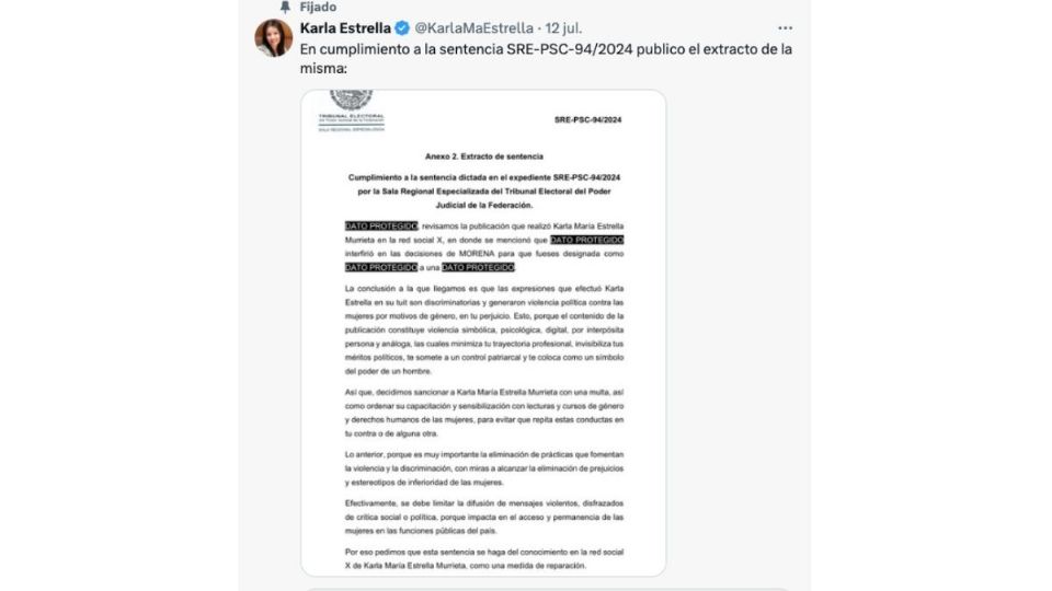“Dato protegido” es un caso que va más allá de obligar a Karla Estrella Murrieta a disculparse públicamente en la red social “X” por haber incurrido en “violencia política” en contra de una diputada federal perteneciente a la coalición gobernante.