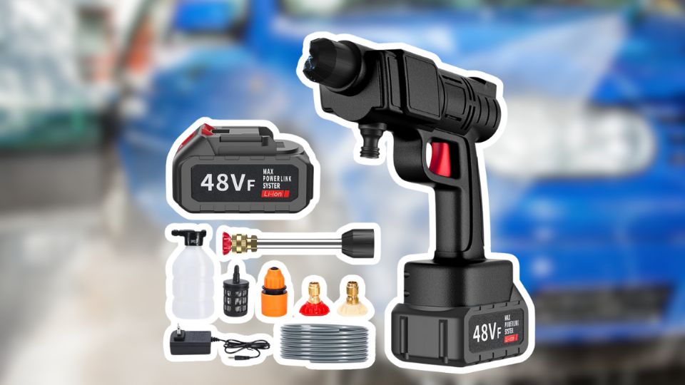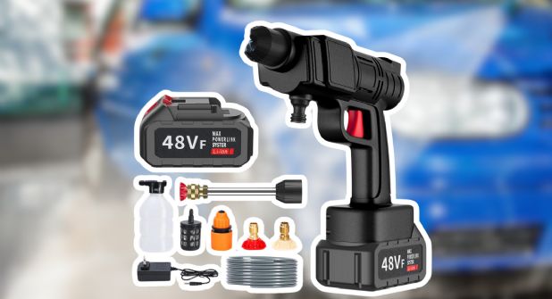 Lo primero que hay que destacar es su diseño compacto e inalámbrico. A diferencia de las hidrolavadoras tradicionales que requieren toma de corriente y una instalación complicada, este modelo funciona con batería y es completamente autónomo. Eso significa que puedes llevarla donde quieras sin preocuparte por enchufes. Ideal para lavar el auto desde cualquier ángulo, sin esfuerzo ni restricciones.