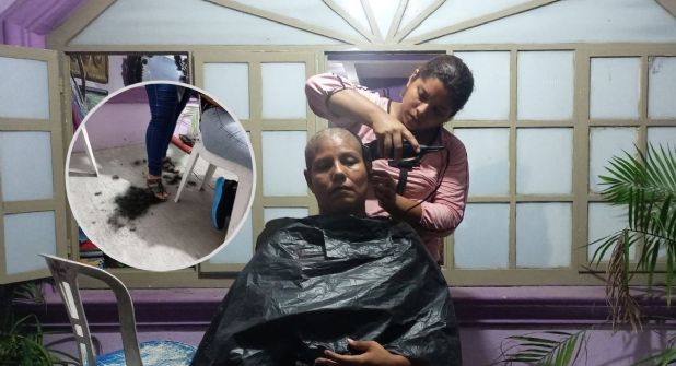 La mujer que sostiene la máquina es su hija, Erika, quien la acompaña en el proceso, al igual que toda su familia. Minutos antes rapó al esposo de su mamá, Agustín, en un símbolo de solidaridad y apoyo a su esposa, también decidió cortarse el cabello.