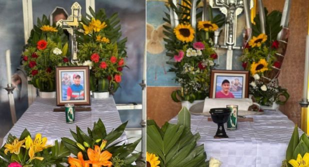 PEROTE, VR.-. Bajo la galera se observan dos altares para los hermanos Jorge y Alberto Cortina Vásquez. Es el espacio donde se ofrecen rosarios para los dos trabajadores del campo. Sus fotografías, flores de colores y una decena de veladoras en forma de cruz sobre el piso de tierra es lo primero que llama la atención al llegar al domicilio donde los velaron.