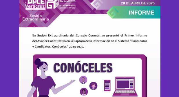 Minutos previos en la sesión extraordinaria, se entregó el informe al Consejo General del Organismo sobre las actividades que rinde la Unidad Técnica de Transparencia como área encargada de coordinar la implementación y operación del Micrositio “CONÓCELES”, para el Proceso Electoral Local Extraordinario para la elección de personas juzgadoras del Poder Judicial del Estado de Veracruz 2024-2025, correspondiente al mes de abril de 2025.