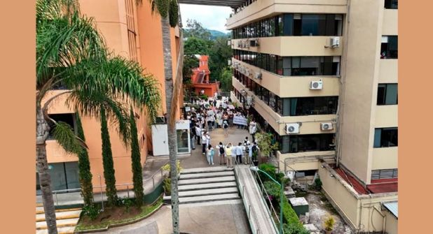 Las y los participantes mantuvieron un plantón permanente frente a las plumas de ingreso del estacionamiento de la Unidad Central de Rectoría desde el mediodía de este lunes hasta poco después de las 16:00 horas