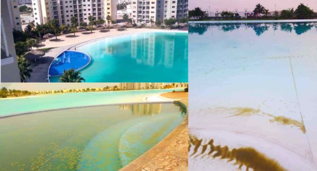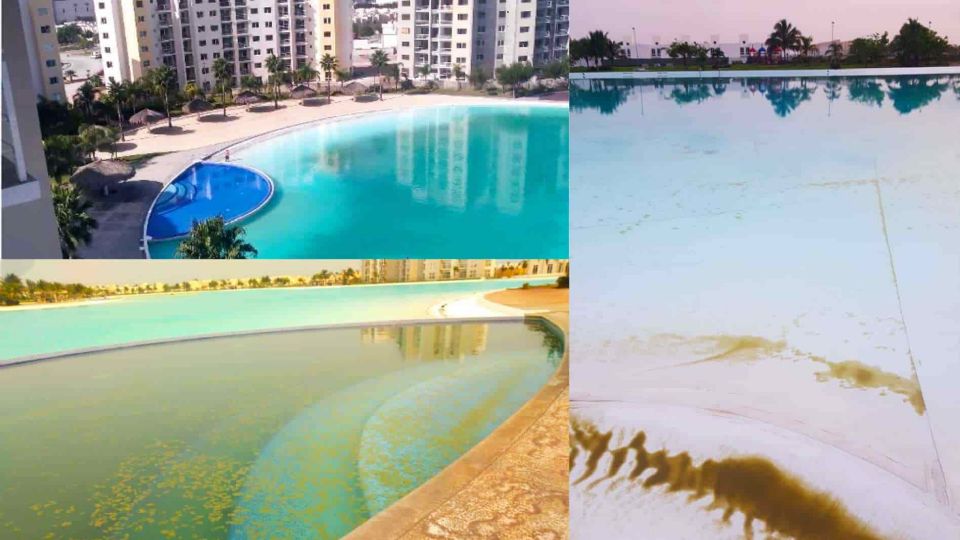 La alberca que se prometió como una playa artificial mantiene el agua estancada que comenzó a tener una tonalidad verdosa y un olor desagradable, mientras que juegos infantiles quedaron inservibles.