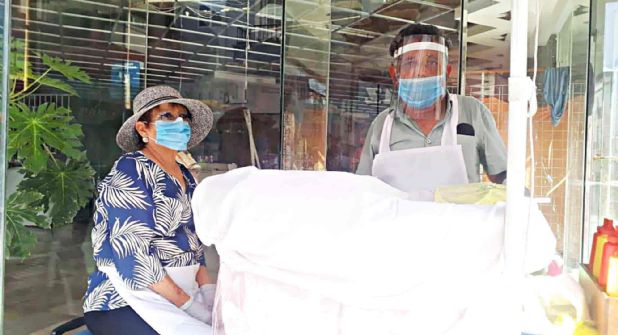 Con careta, cubrebocas, gel y guantes es como Adriana y Fermín atienden a los clientes, ambos forman parte de los sectores de la población que más riesgo tienen a contraer covid, el hombre de 70 años es hipertenso y aparte tiene un marcapasos que lo ayuda a vivir.
