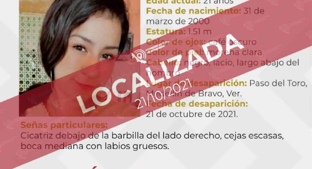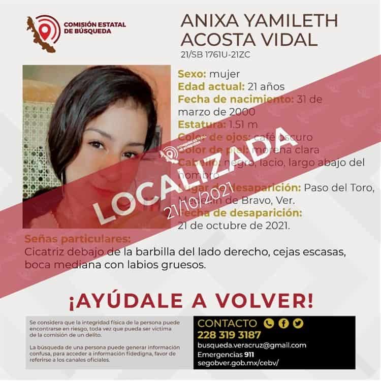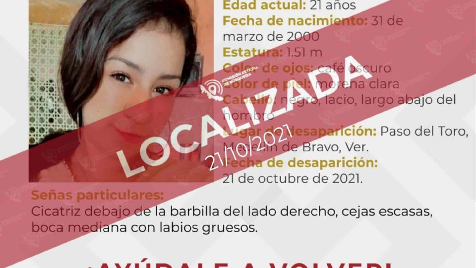 Anixa Yamileth Acosta Vidal de 21 años, fue reportada como desaparecida el 21 octubre en Paso del Toro, en Medellín de Bravo, de inmediato sus familiares reportaron su desaparición a la Comisión Estatal de Búsqueda que emitió una ficha para su localización.