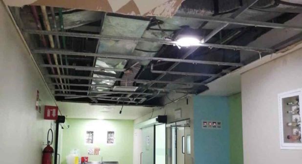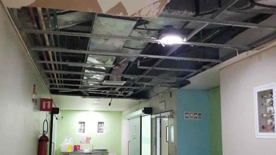 De acuerdo con lo difundido en Facebook, los plafones del techo de una sección de la torre ya no están, dejando expuestos tubería, canales de ventilación y de iluminación, además de la estructura que soportaba las placas de yeso antes de caerse.