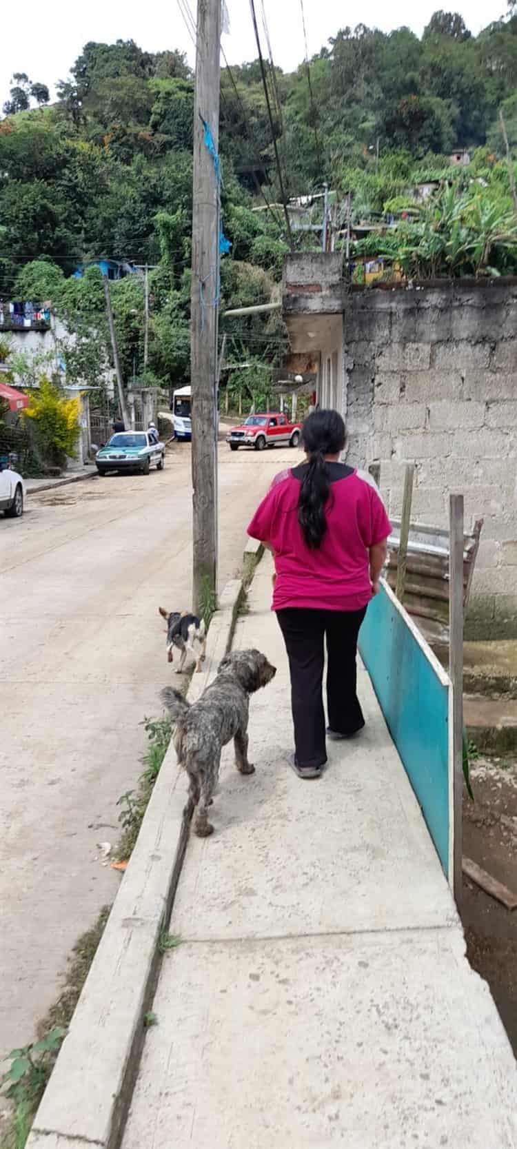 La mujer que camina junto a su perro sobre la acera que lleva a su domicilio recalca que detrás de su casa el agua provocó el deslave de la tierra, por lo que tiene temor a regresar pues sabe que continuarán las lluvias.