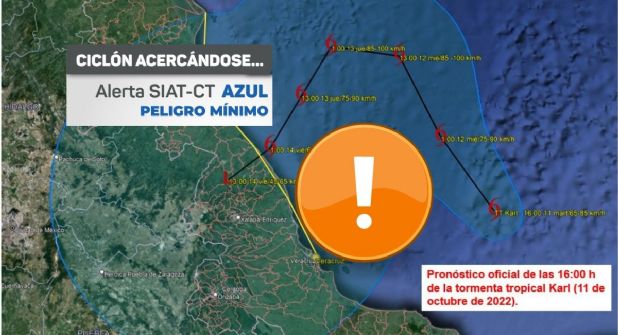 La Alerta Azul fue emitida la tarde de este martes 11 de octubre del 2022 por el Sistema de Alerta Temprana para Ciclones Tropicales de la Coordinación Nacional de Protección Civil. Este tipo de alertamiento indica que existe un peligro bajo por el paso de la tormenta tropical Karl.