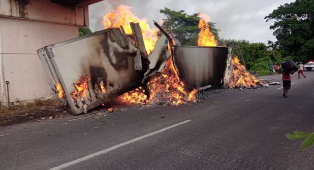 XALAPA, VER.- Un tráiler que cargaba cajas de cigarro y, que transitaba por la autopista Cosoleacaque - La tinaja fue asaltado y posteriormente incendiado, la tarde de este domingo 16 de octubre.