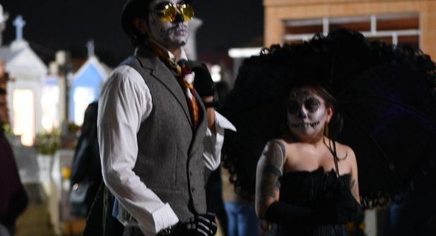 XALAPA, VER. -El Día de Muertos en Naolinco, Veracruz, es tradición y también diversión. Jóvenes y adultos aprovecharon para usar sus mejores disfraces y vivir la tradicional “cantada” en el cementerio municipal.