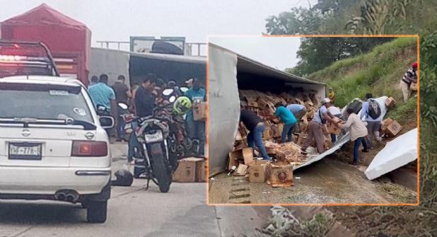 COSOLEACAQUE, VER. - Pobladores del sur de Veracruz no dudaron en cometer actos de rapiña, luego de que un tráiler que transportaba cervezas terminó volcado sobre la autopista La tinaja-Cosoleacaque la mañana de este lunes 28 de noviembre; el chofer de la unidad no presentó mayores lesiones tras el incidente.