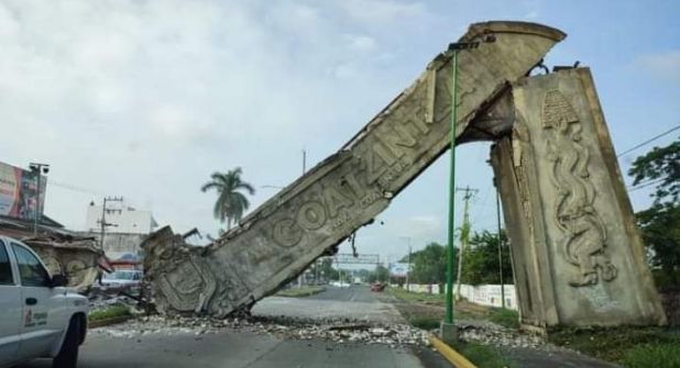 COATZINTLA, VER.- El arco de concreto que se encuentra a la entrada del municipio de Coatzintla, al norte de Veracruz, se desplomó sobre ambos carriles de la carretera Coatzintla-Martínez de la Torre, durante la mañana de este martes 16 de agosto.