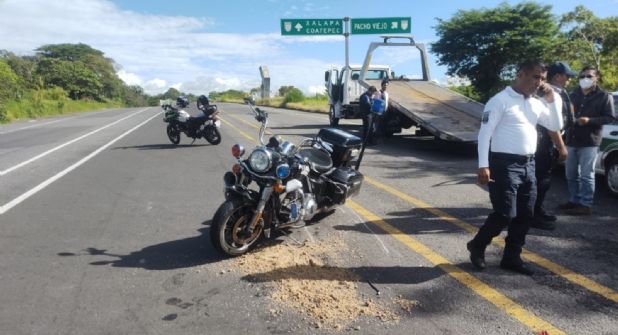 XALAPA, VER.- Un elemento de la policía vial de la Secretaría de Seguridad Pública (SSP) chocó su motocicleta en contra de un taxi en el libramiento de Coatepec, causando daños a la unidad de transporte público.
