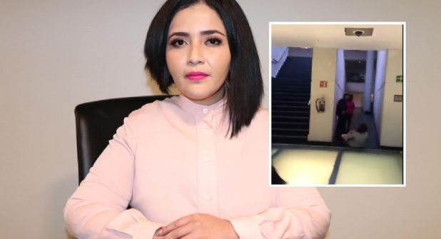 En las imágenes que duran cerca de diez segundos, se observa la senadora de Morena plurinominal empujar a una joven que cae en uno de los pasillos de la cámara alta.