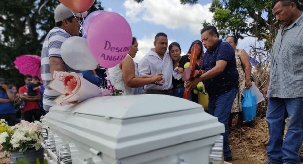 Un ataúd blanco con dorado de escasos metro y medio es bajado con cuidado ante la presencia de familiares y amigos, que con rabia e impotencia dicen adiós a la pequeña que cursaba el segundo grado de kínder.