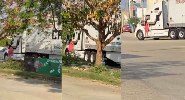 El vídeo comenzó a circular durante las primeras horas de este lunes 30 de enero, y ya se hizo viral en redes sociales; en él se aprecia a una mujer adulta con una bata color rosa lanzando reclamos al chófer que maneja un tráiler de la empresa de paquetería Castores, que conduce sobre la avenida Cánticas de la colonia antes mencionada.
