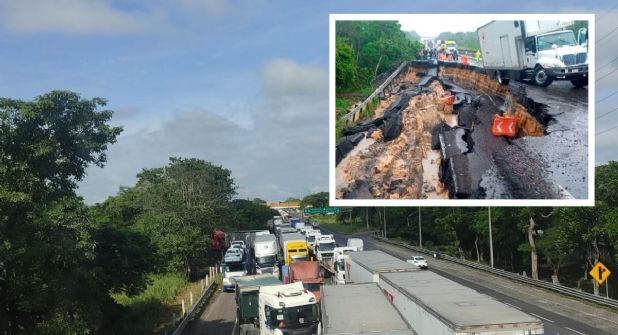 COATZACOALCOS, VER.- Las carreteras del sur de Veracruz se encuentran colapsadas desde el jueves 2 de noviembre, tras el cierre de la autopista Nuevo Teapa-Cosoleacaque, por la formación de un enorme socavón tras los efectos del Frente Frío 8, a la altura del kilómetro 8, en el carril que conduce a Nuevo Teapa. La fila de unidades, en su mayoría de carga, abarca varios kilómetros sin que puedan avanzar.