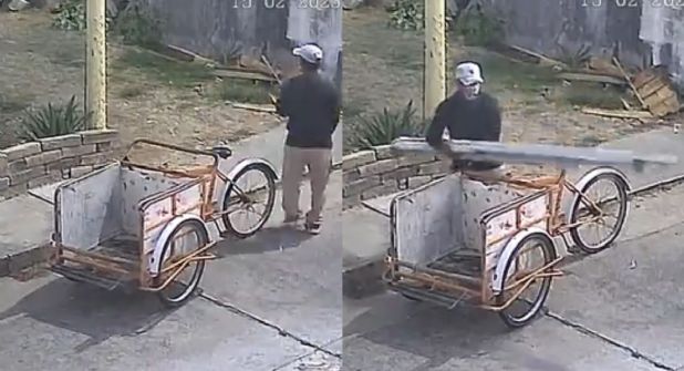 En un video que fue captado por cámaras de vigilancia de otra vivienda cercana, con fecha 15 de febrero, se observa a un hombre que detiene su triciclo sobre la calle Lechuzas al percatarse de las estructuras en el patio de una casa, ante la falta de un portón ingresa de forma sigilosa y logra sacar láminas amarradas y pedazos de tubo de aluminio.
