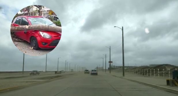 Sobre la avenida Primero de Mayo de la colonia El Tesoro, en Coatzacoalcos, un automóvil color rojo fue aplastado por una palmera derribada por los fuertes vientos en la ciudad sureña:
