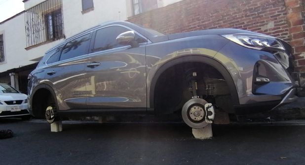 La mañana del 5 de febrero, los propietarios de la camioneta Dodge Journey de cuatro puertas, color gris, la encontraron en el lugar en donde la habían dejado estacionada, pero en vez de las llantas, había blocks sobre las que estaba colocada.