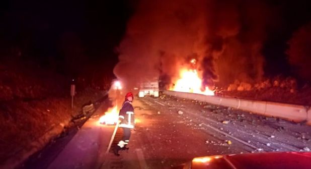Se habla que en el percance con volcadura e incendio participaron al menos tres tráileres y una camioneta particular, de los cuales, un tractocamión con un remolque tipo tolva explotó.