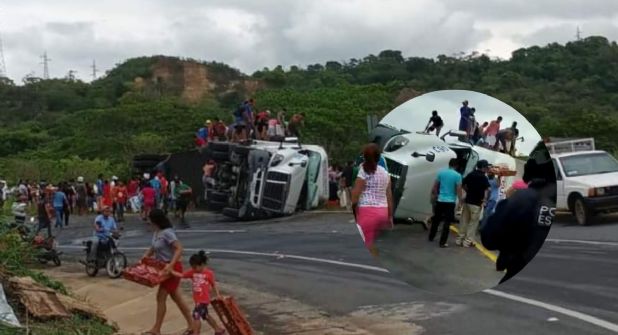 En el video se observa como decenas de personas que habitan en las comunidades cercanas y automovilistas que se detuvieron, comienzan a levantar el producto que quedó regado a un costado de la carretera y dentro del tractocamión.
