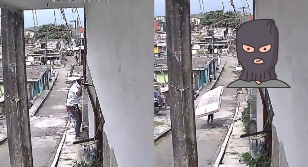 El hurto ocurre a plena luz del día, mientras dos personas, aparentemente vecinos de la colonia, voltean a ver el colchón cuando este cae por la barda, pero no prestan más atención y entran a una casa. Acto seguido, el individuo carga el colchón en su espalda y sin prisa recorre la calle.
