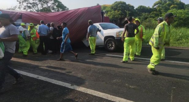 AGUA DULCE, VER. - Un triple choque entre dos unidades de carga y una camioneta de Petróleos Mexicanos (PEMEX), provocó el cierre parcial de la carretera estatal carretera Coatzacoalcos - Villahermosa a la altura de la entrada del municipio de Agua Dulce al sur de Veracruz. Además de la volcadura de un tráiler que terminó derramando el producto que transportaba, generando actos de rapiña de parte de los pobladores de aquella región la tarde de este miércoles 12 de julio.