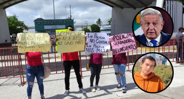 COATZACOALCOS, VER.- Amigos de Alexis Moreno, joven estudiante asesinado por policías de la Secretaría de Seguridad Pública (SSP) en Coatzacoalcos, Veracruz, se manifestaron a las afueras del Sistema Portuario Nacional Veracruz (ASIPONA) en el municipio sureño, durante la visita del Presidente Andrés Manuel López Obrador al estado. Esperaban hablar con el mandatario federal.