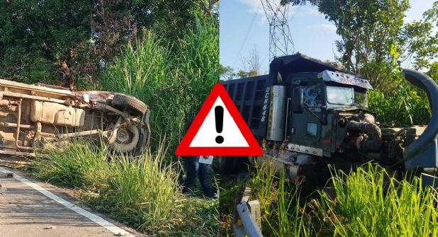 En la misma vía circulaba un volteo de 14 metros cúbicos, color verde en su cabina, marcado con el número de serie UCH648 de la unión de volqueteros de Las Choapas. De acuerdo con los reportes de las autoridades, una de las dos unidades invadió carril chocando por el costado.