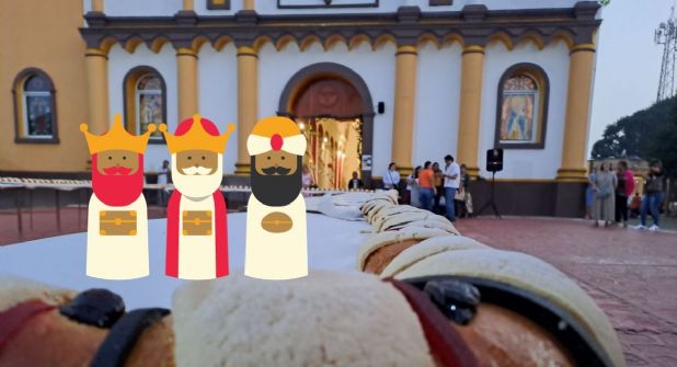 ZARAGOZA, VER. - Integrantes de la iglesia católica del municipio de Zaragoza al sur de Veracruz, colocaron frente a la parroquia una enorme rosca de Reyes que compartieron con la comunidad en general como parte de una actividad altruista en el marco de la celebración del Día de Reyes Magos.