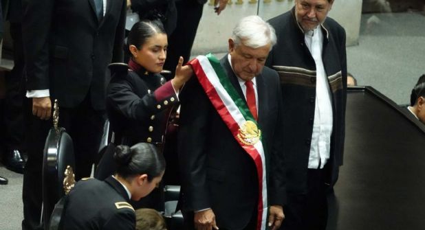 Como parte de la ceremonia de protocolo se invitó al ex presidente Andrés Manuel López Obrador que entregaría la banda presidencial a la primer mujer presidenta. Su llegada a la sede del Palacio Legislativo causó revuelo entre los diputados federales que no perdieron la oportunidad de dar un abrazo y tomarse la última selfie con el morenista.
