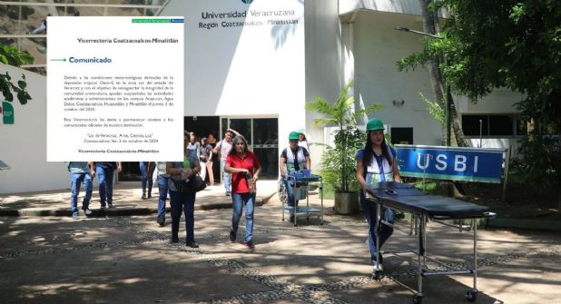 "Debido a las condiciones metereológicas derivadas de la depresión tropical Once-E, en la zona sur del estado de Veracruz y con el objetivo de salvaguardar la integridad de la comunidad universitaria, quedan suspendidas las actividades académicas y administrativas en los campus Acayucan, Agua Dulce, Coatzacoalcos, Huazuntlán y Minatitlán el jueves 3 de octubre del 2024", dice el comunicado.