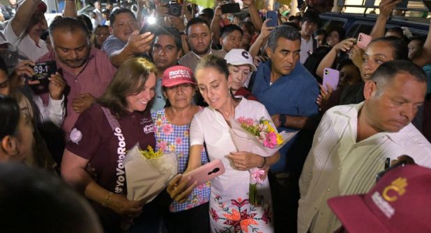 La candidata arribó al municipio con varias horas de atraso, sin embargo, a su llegada fue recibida por los pobladores y militantes de Morena, a quienes saludó mientras caminaba entre las vallas en dirección al estrado.