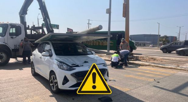 COATZACOALCOS, VER. - Un enorme señalamiento de metal cayó sobre un automóvil particular, al momento en que transitaba sobre la avenida Universidad en el Puerto de Coatzacoalcos al sur del estado de Veracruz, la tarde de este martes 9 de abril. En la unidad viajaban madre e hija que por suerte no sufrieron lesiones y lograron salir a tiempo.