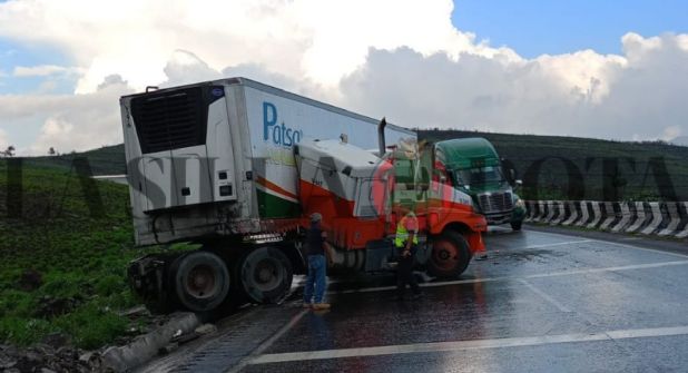Este incidente se registró sobre el kilómetro 252 justo en el Trébol de Maltrata, donde el conductor de un tráiler con caja seca refrigerante de la empresa PATSA, perdió el control de su unidad por presunto exceso de velocidad y el asfalto mojado, provocó que se derrapara y saliera del camino y terminara descuadrado.