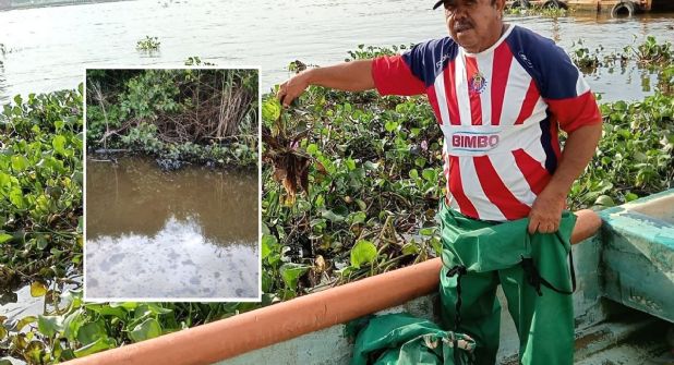El olor que se percibe es como a petróleo, y son varios metros de la orilla donde se ha extendido la contaminación, afectando el lirio acuático y manchando algunas embarcaciones, por lo que este día no pudieron salir a capturar.