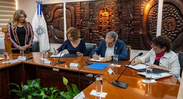 En la sala de juntas de la Rectoría, Rosaura Ruiz Gutiérrez, secretaria de Ciencia, Humanidades, Tecnología e Innovación (Secihti) del gobierno federal, atestiguó la firma en la que también estuvo presente Carmen Enedina Rodríguez Armenta, encargada de despacho de la Subsecretaría de Educación Superior de la Secretaría de Educación Pública.
