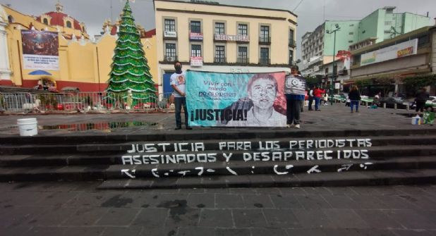 Con una camisa que lleva la fotografía de Moisés Sánchez y con una manta de varios metros que dice "Vivir con miedo no es opción ¡Justicia!" frente al palacio municipal de Xalapa, Jorge exige justicia para el asesinato de su padre.