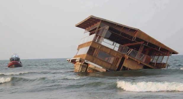 El restaurante se partió en dos y ambos módulos fueron arrastrados por la corriente