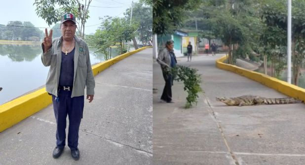 XALAPA, VER.- Un trabajador de Parques y Jardines del Ayuntamiento de Isla, al sur de Veracruz, se volvió viral en las redes sociales luego de se le captara ahuyentando con la rama de un árbol, un cocodrilo que se salió de la laguna a la vía pública en la cabecera municipal.