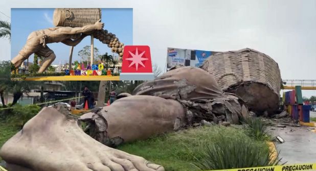 VERACRUZ, VER.- El monumento a El Colotero, ubicado en la cabecera municipal de Álamo Temapache, Veracruz, colapsó esta mañana de martes 16 de diciembre. La escultura de 15 metros de altura, se fragmentó, por lo que los pies, las naranjas y el cuerpo del campesino quedaron regados sobre la calle.