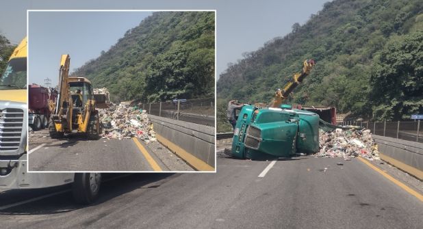 El vehículo, un tráiler Kenworth color verde con placas del servicio público federal 02-BB-9H, perdió el control por razones que aún no se han determinado. La unidad remolcaba una tolva con toneladas de basura, que quedaron esparcidas sobre la carpeta asfáltica y bloquearon ambos carriles de circulación.