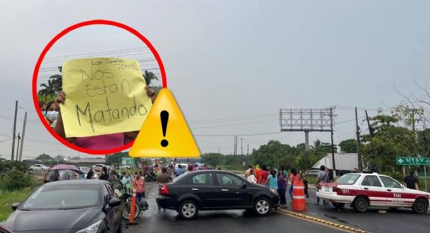 Con cartulinas, cuerdas, palos y hasta ramas de árboles, los pobladores mantienen cerrado ambos carriles de la carretera Costera del Golfo, sin permitir el paso a ningún tipo de unidad. A pesar de que llevan más de 12 horas con el cierre del tramo, ninguna autoridad los ha atendido.