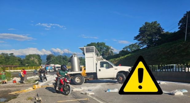 Una camioneta de 3.5 toneladas se impactó contra el muro de contención tras presuntamente presentar una falla mecánica. En la zona, se encuentra una persona lesionada que viajaba en la parte trasera de la unidad y el producto que el vehículo de carga transportaba, se regó sobre el asfalto.